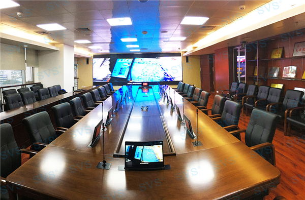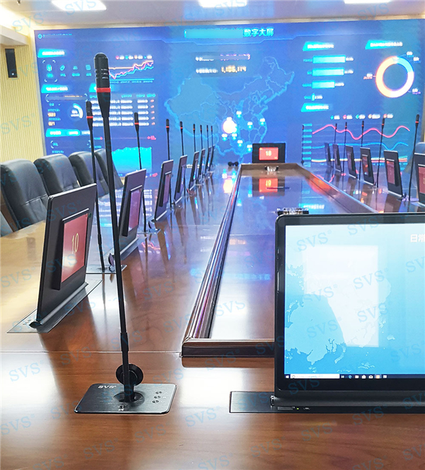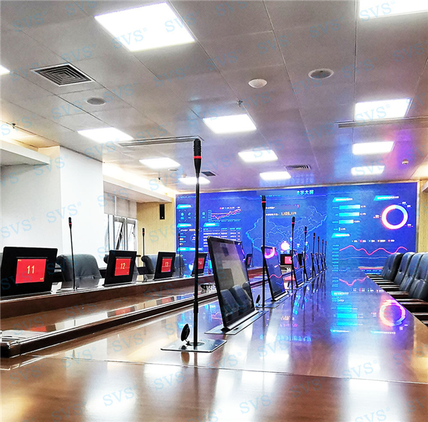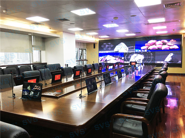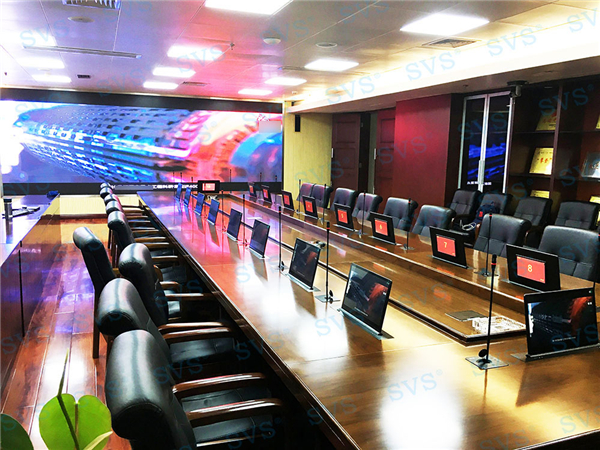 SVS為某集團(tuán)打造無紙化會議室,會場共設(shè)18個席位。為客戶推薦使用雙屏升降器SV-LCD17TD+話筒升降器D3070A/B,輕松實現(xiàn)普通會議、無紙化會議、多媒體會議等多種會議模式的切換。