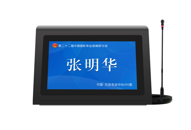 ? 產品特性:全鋁外殼,帶攝像機,帶發言話筒,網線(POE)供電,數據信息無線(wifi)接收,雙面電子桌牌,可一面顯示單位名、人名、職位。能在屏幕上直接書寫人名,職位即可在屏幕上顯示。另一面能顯示部分會議終端的內容如會議議程,呼叫服務,會議通知,等等。
