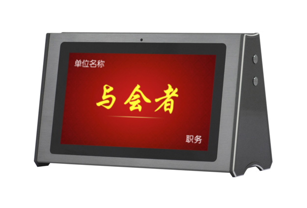 ? 產品特性:全鋁外殼,帶攝像機,網線(POE)供電,數據信息無線(wifi)接收,雙面電子桌牌,可一面顯示單位名、人名、職位。能在屏幕上直接書寫人名,職位即可在屏幕上顯示。另一面能顯示部分會議終端的內容如會議議程,呼叫服務,會議通知,等等。