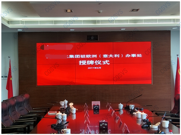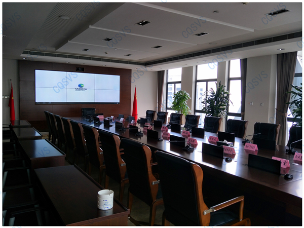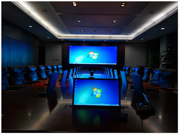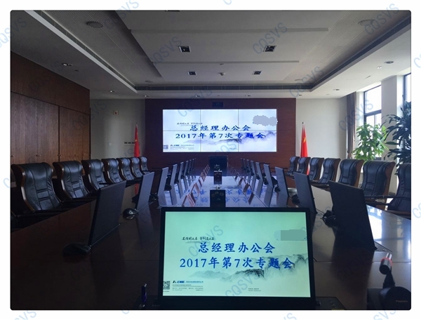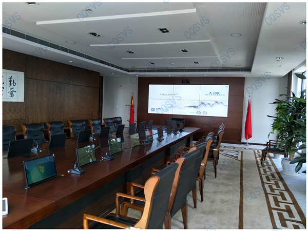 此次我司有幸為某集團公司打造智能會議室項目。該公司領導前期到我司考察后,對我司團隊的整體運營能力比較滿意,通過在前期方案設計中的不斷溝通,最終確定采用拼接顯示和無紙化會議系統來打造智能化會議室。拼接顯示系統主要采用的是LG原裝47寸2X3拼接,無紙化會議系統則采用SVS液晶升降器來實現。